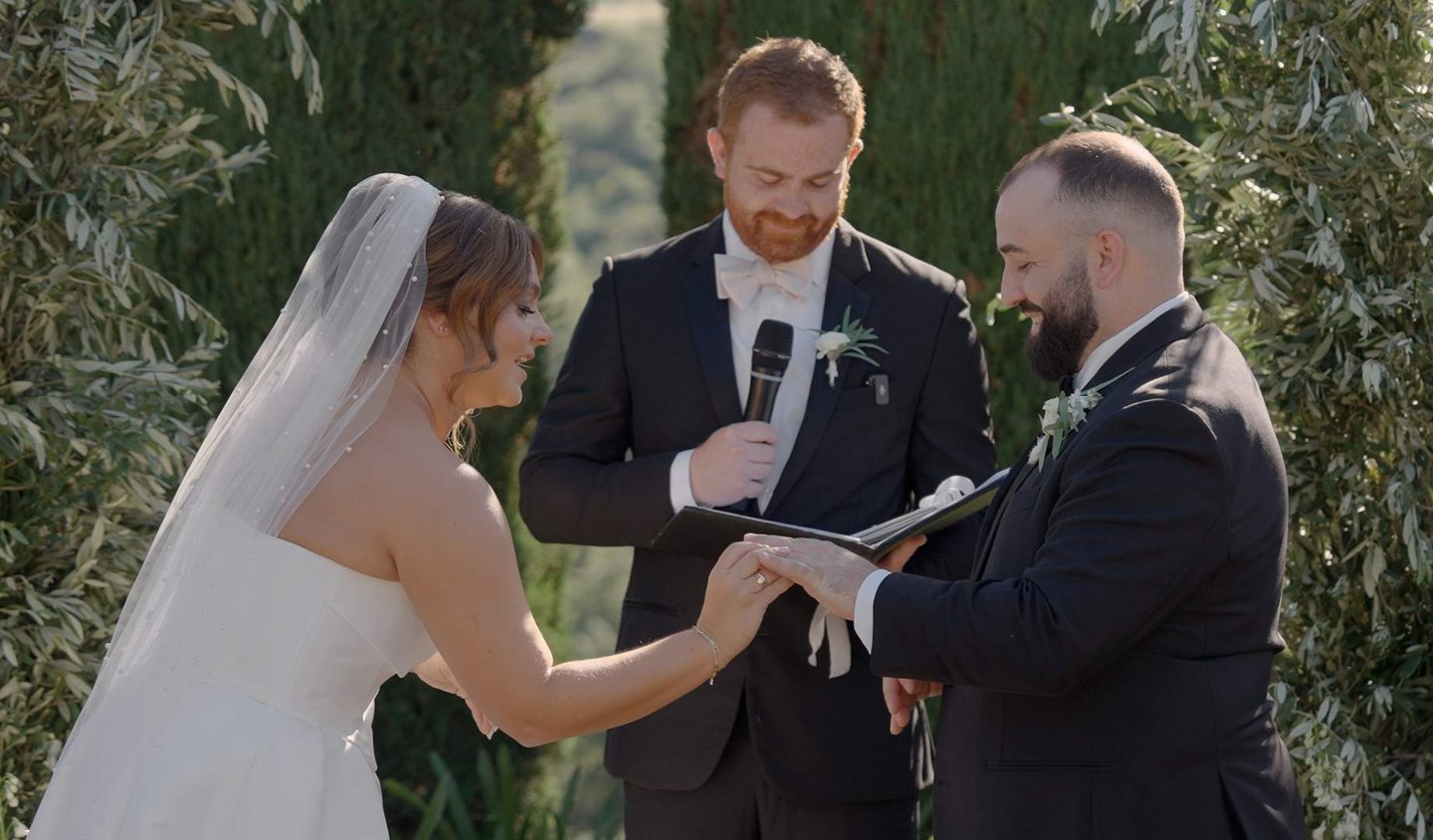 La cerimonia si è svolta all'aperto, nel giardino di Villa La Selva, con un arco di ulivi come sfondo. Questo dettaglio ha creato un'atmosfera calda e accogliente per la cerimonia civile, officiata dal fratello della sposa, rendendo il momento ancora più personale.